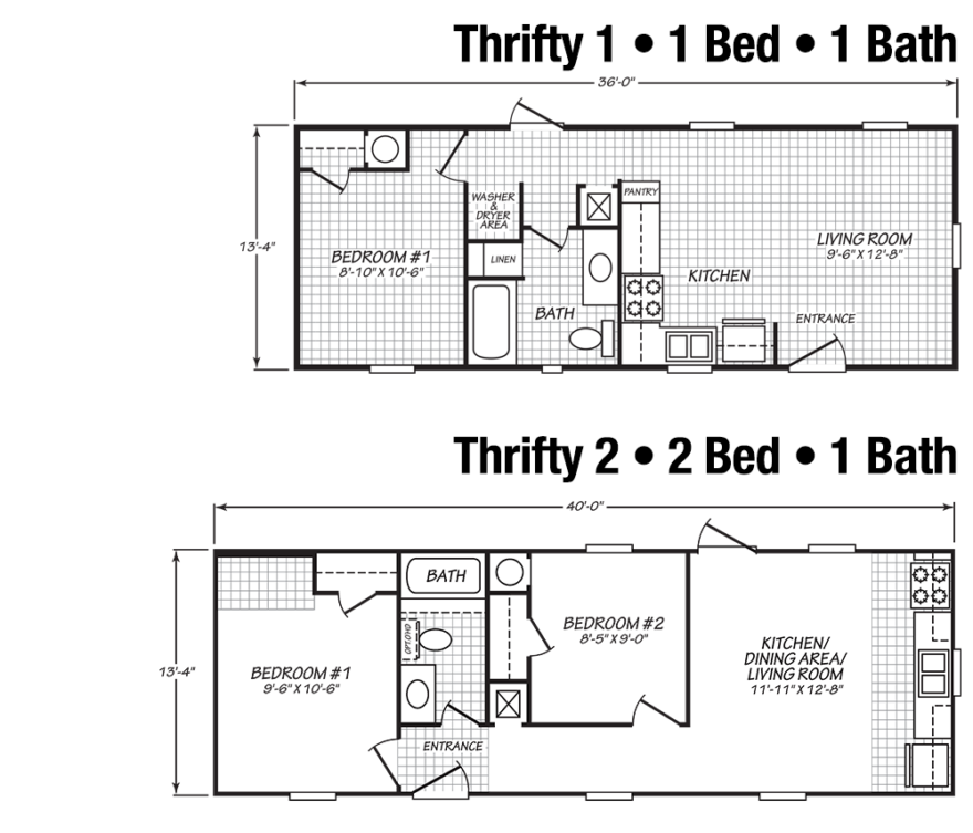 The Thrifty Family of Plans model has 1 or 2 Beds and 1 Bath. This 426 – 660 square foot Single Wide home is available for delivery in Texas.